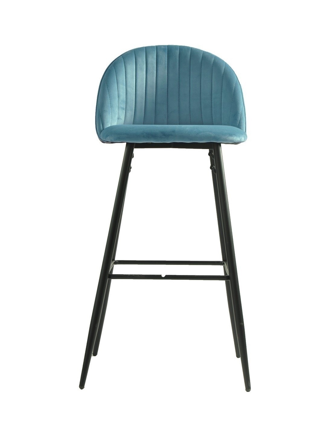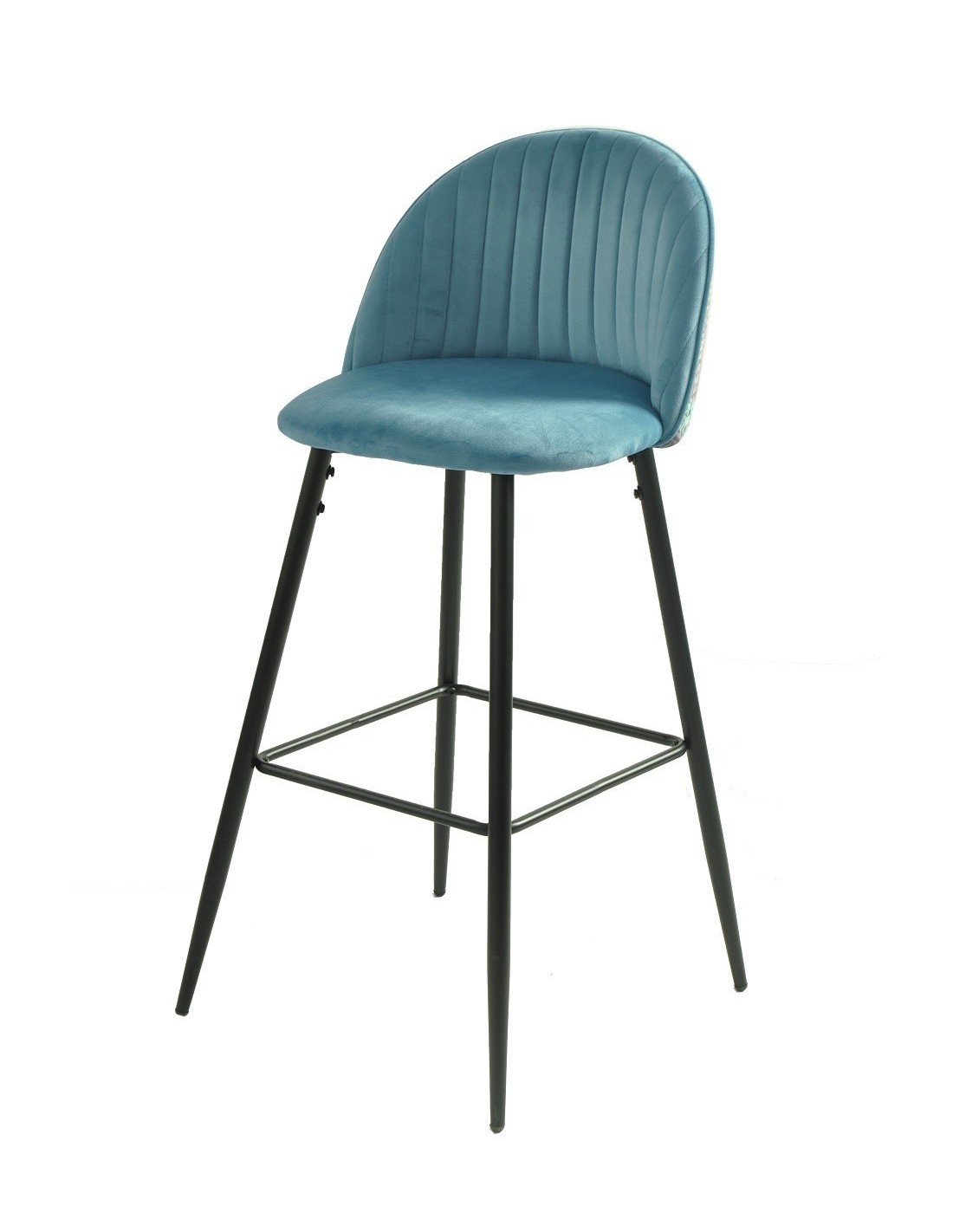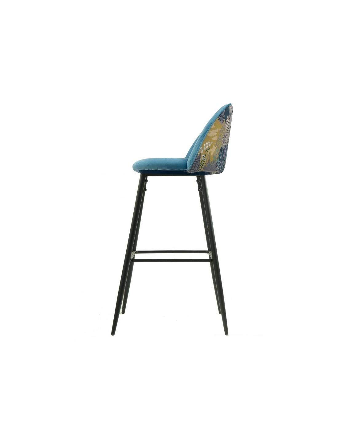 Taburete de diseño, armazón metálico con acabado epoxi negro, asiento y respaldo tapizados en terciopelo azul, trasera en tejido decorado palm. Otros colores disponibles. Silla a juego