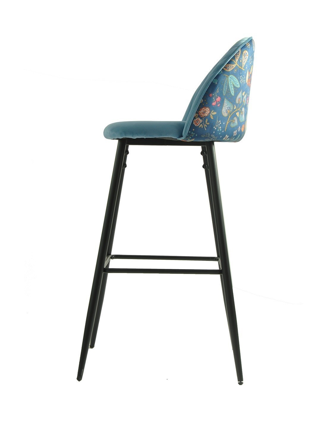 Taburete de diseño, armazón metálico con acabado epoxi negro, asiento y respaldo tapizados en terciopelo azul, trasera en tejido decorado carnaval. Otros colores disponibles. Silla a juego