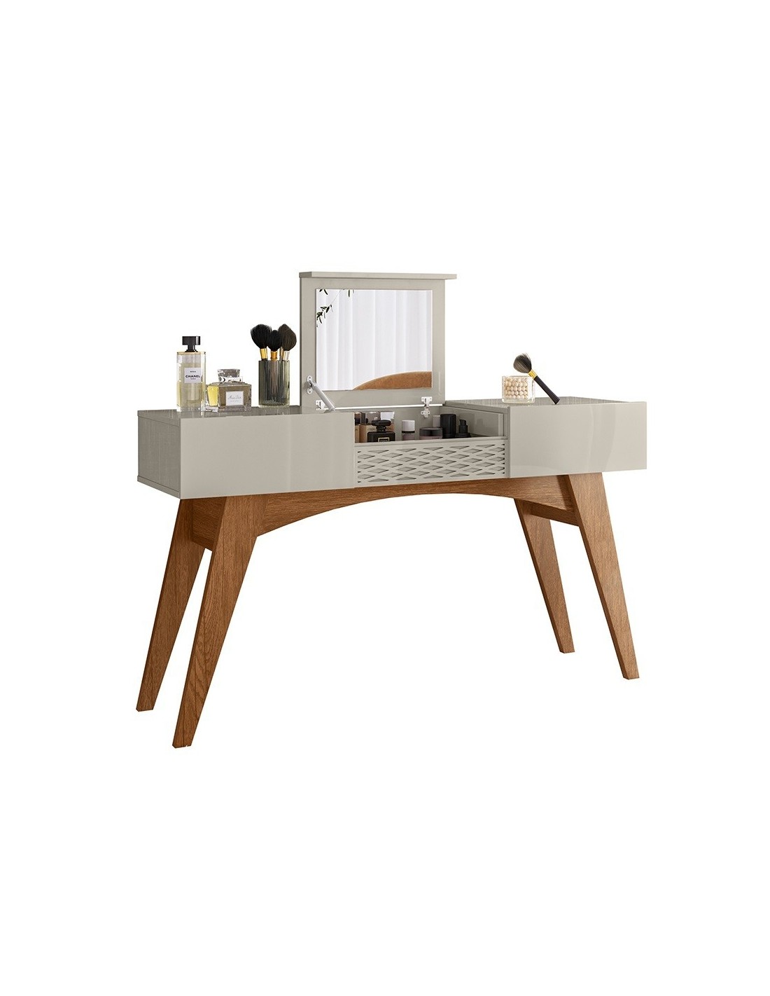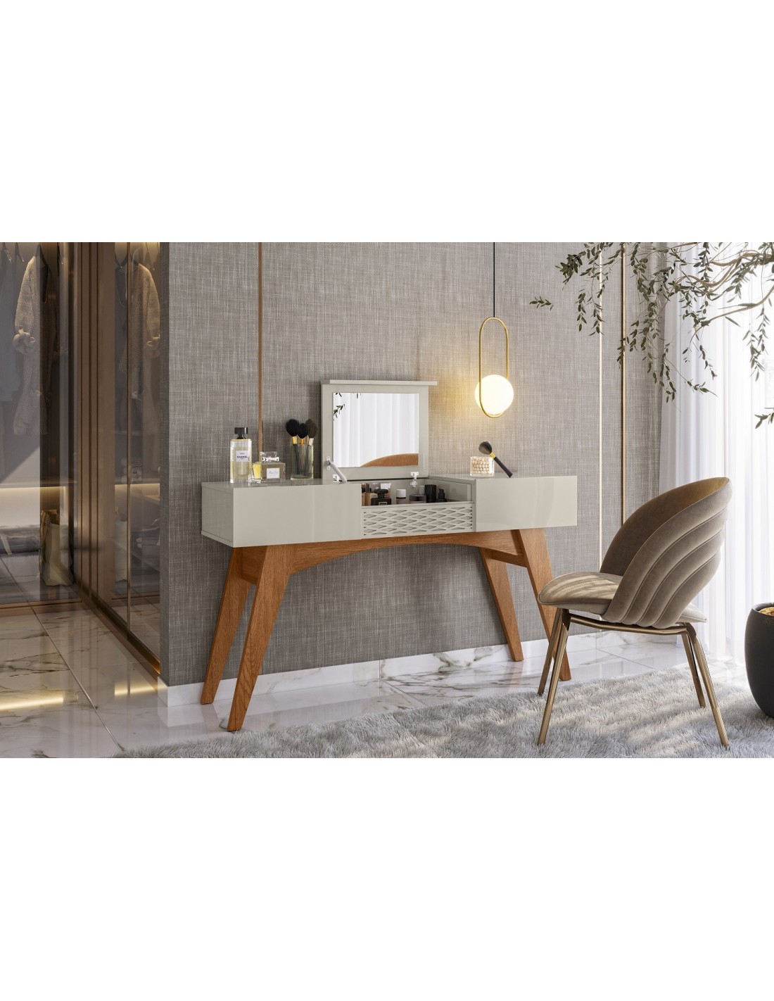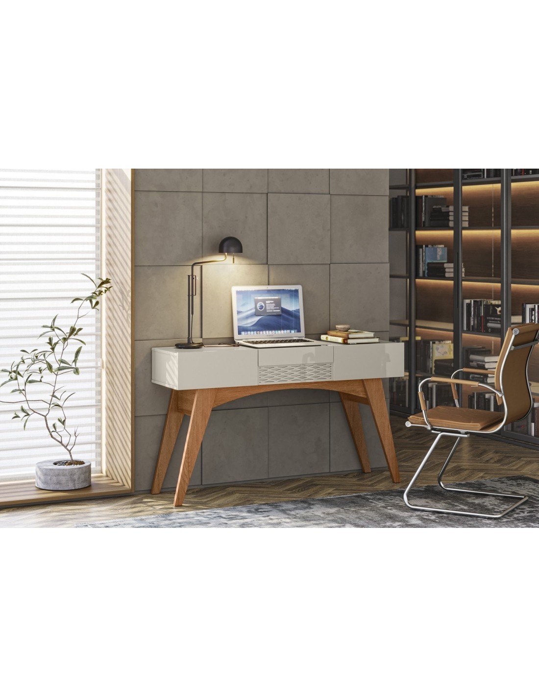 Mesa de diseño fabricada con laterales de cristal templado con acabado transparente. 12 mm. de espesor. Cajonera lacada en blanco alto brillo